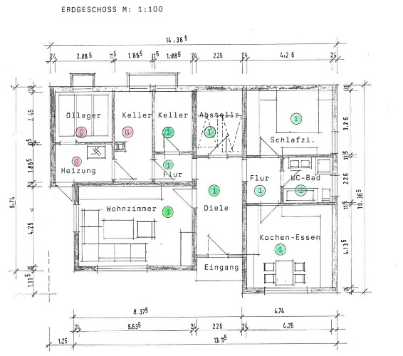 2 Einbauküchen, Fußböden teilweise Laminat, Teppich, Fliesen, Parkett, Kork.